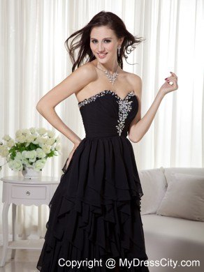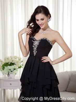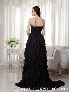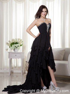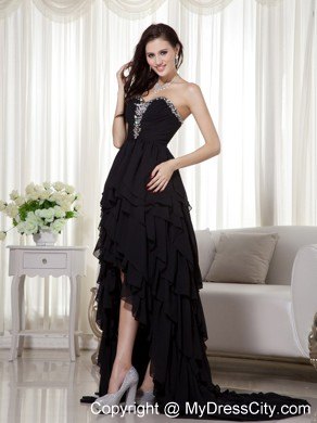 Gorgeous and flirt prom dress features a beaded sweetheart neckline with flowery crystal accents on the middle of the fitted ruching bodice. Layers of chiffon ruffles completes the flowy high-low skirt and a standing out look. The back is finished with zipper.
