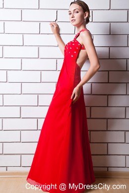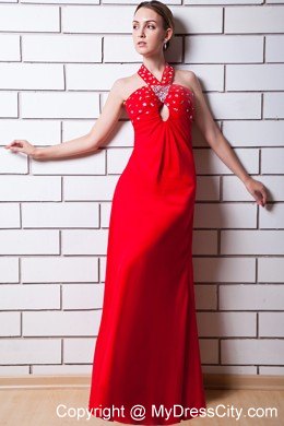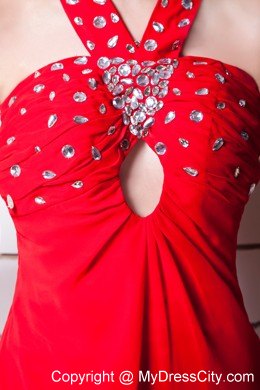 A masterpiece! Dance the night away in this red prom dress! It's a halter top design and ruched bust with a keyhole cut out on the centre. The stunning dotted crystals and beads on the chest and the straps make the dress shimmery. Smooth line flows from the high waist to floor curves most figures. The crossed back with beaded straps and the simple zipper up closure continues the chic and charm of a hot prom dress.