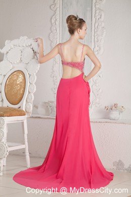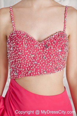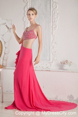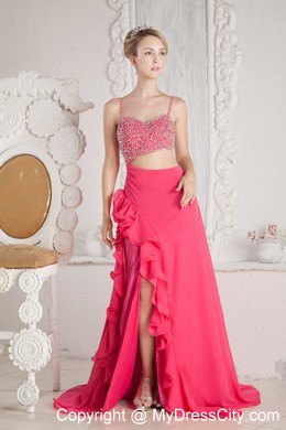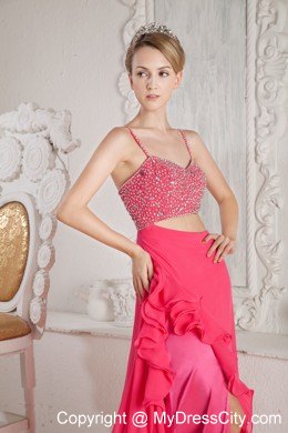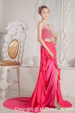This breathtaking dress will make your day one to remember! Bold and sexy are the characteristic of this amazing prom dress. The spaghetti straps and bust with a modified sweetheart overflow with shimmering beading. The soft and romantic chiffon skirt just connected the corner on the bodice makes you risky but arouse your infinit imagination. The seductive side slit with a whimsical ruffled hemline for accent and a brush train complete overal silhouette.