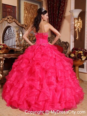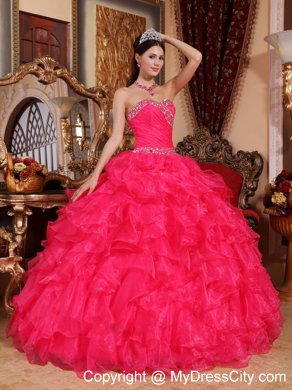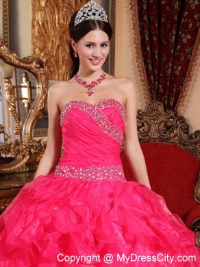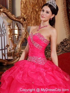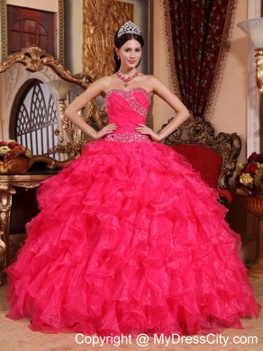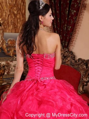 This elegant sweetheart neck red quinceanera dress is featured with the beautiful shaped ruffles on the bottom of the dress. The top part of the dress is decorated with hand made ruching and the straps adorned with shimmering beading on the neckline and around the waist perfect the dress.