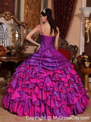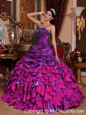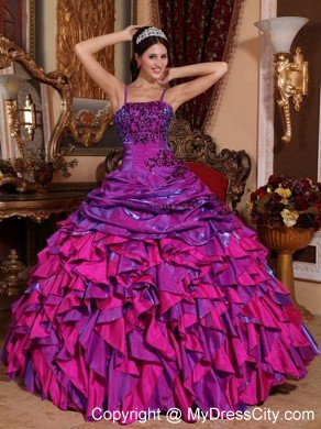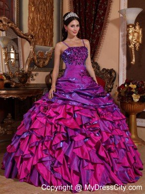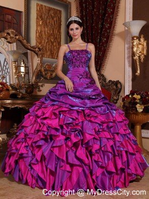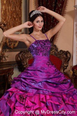 This exclusive strap quinceanera dress is featured with the two toned fabric at the bottom of the dress which is accented with the combination of ruffles in two colors and the small skirt with pick ups. The top part of the dress is adorned wirh black embroidery, You will become the most beautiful girl in this dress!