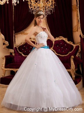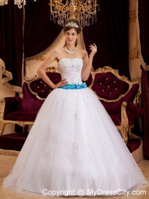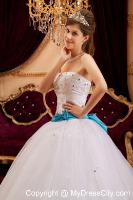 A cute and lovely white wedding gown features with a sexy strapless neckline and a ruched blue band with asmall bow on the front and a extremly big bow on the bottom add the sassy look. The appliques encrusted with blue crystal add the delicate effecting. The layers of organza give you the feel of soft and smooth. A zipper up corset style closure in the back secures the dress in place.
