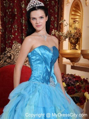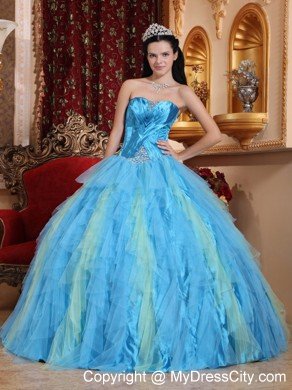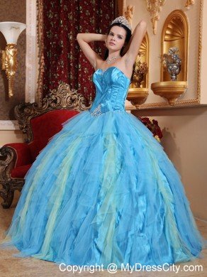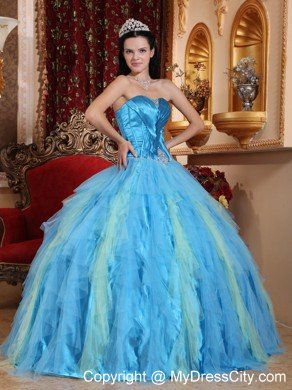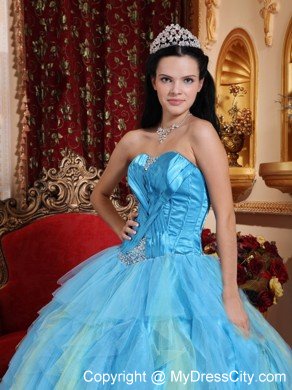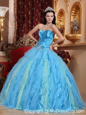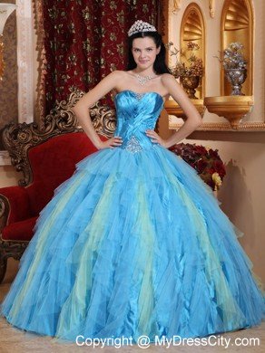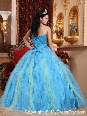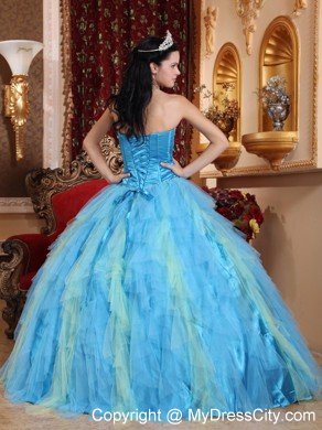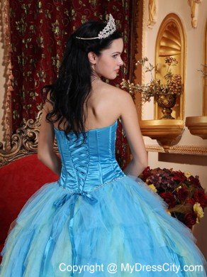 This gorgeous quinceanera dress give us a dramatic feeling.The fitted bodice is accented with all crossed ruchings and exquisite beadwork. Layers of ruffles in contrasting colors flows freely to create a buffant shape.A lace up back completes this wonderful design.
