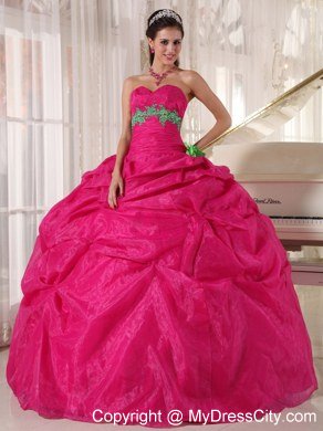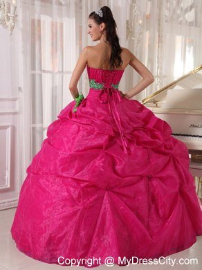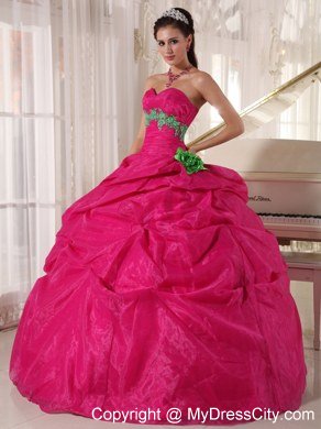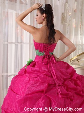This floor length ball gown quinceanera dress features a strapless bodice with a sweetheart neckline and delicate pleats throughout. The floral appliques under the bust area and the flower on the waist adds charming and beauty to the dress. The ruffles in the ball gown make the dress wonderfull. With a lace up back, the dress reaches its fullest beauty.