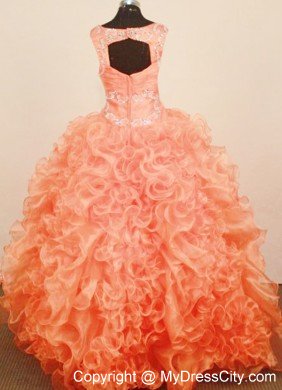 The fitted bodice is gorgeous with exquisite appliques on the strap and on the waistline that contours the waist perfectly.Full skirt is full of amazing rufflles. The back is composed of a keyhole on top and a zipper up below.