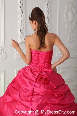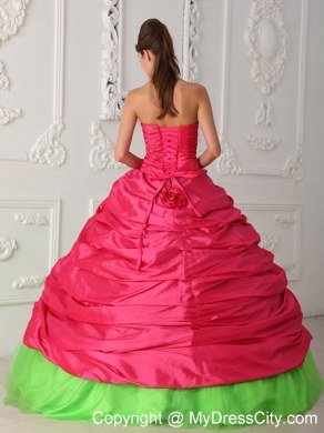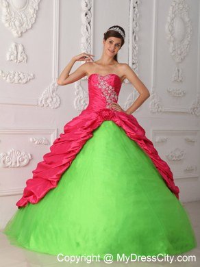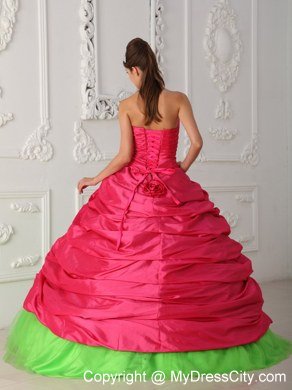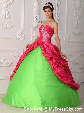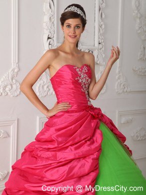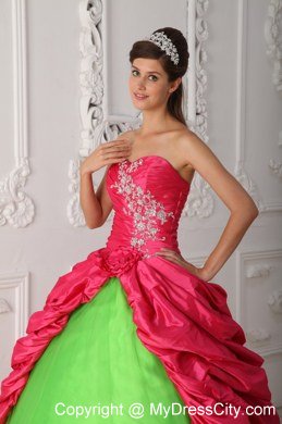 A bold design of quinceanera dress collocate with red and green color makes the skirt eye-catching. Unregular appliques with crystals framed the ruched bodice, which create drama. A dense pick ups making a slit in the front gown flowing form the delicate handed flower surely give the skirt a enchanting style.