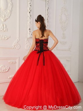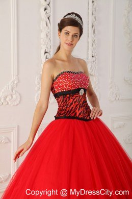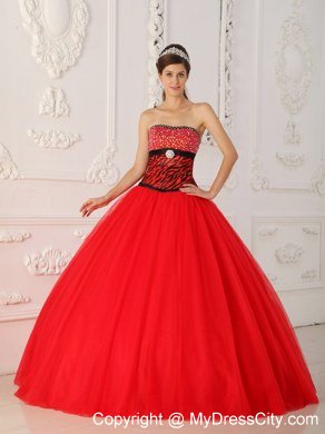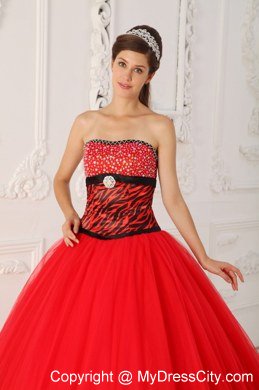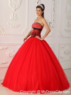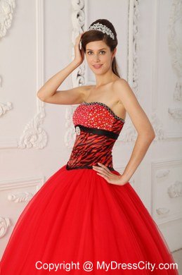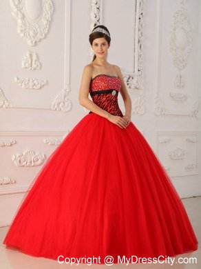 Take a walk on the wild side in this fabulous zebra-inspired dress. The red quinceanera dress features a strapless bodice with a fully beaded bust. The midsection is encrusted with a crystal brooch that draws lots of interest. The gorgeous A-line skirt is made from satin with tulle surface, which add to its beauty, fullness and lovely shape. This is a fantastic choice for someone wanting something a little different for their special occasion.