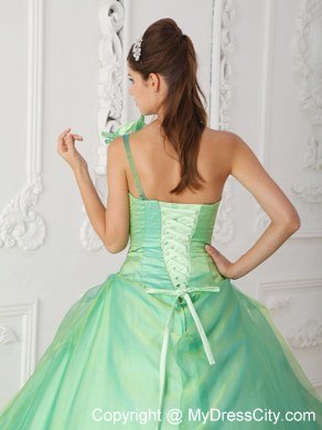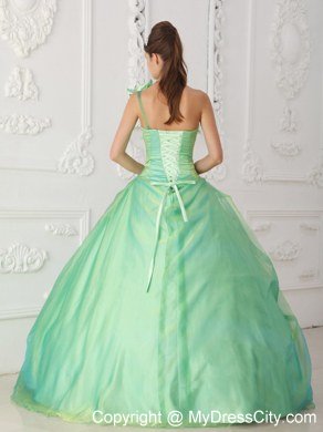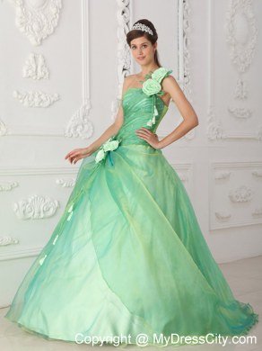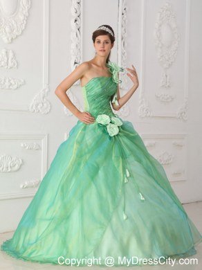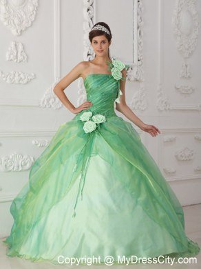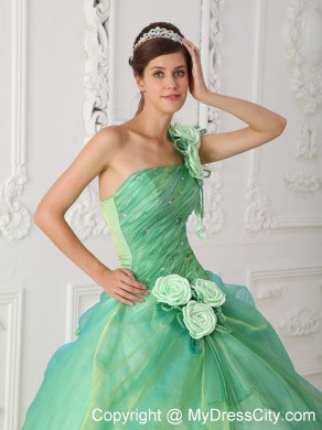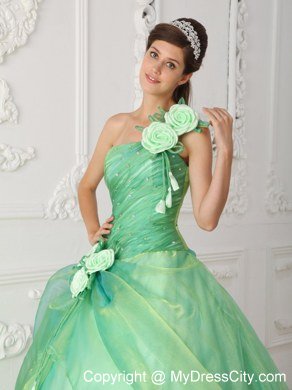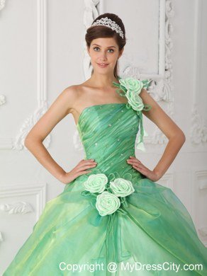 We love classical-inspired dresses. This one has such a charm! It features a pretty one shoulder top made from delicate handed roses. The bodice is embellished with beading and rhinestones. A waist is adorned by the same pretty roses which add details to the midsection. The A-line skirt features two tiers. The top one is ruffled and split in a V to reveal the flowing underskirt. The quinceanera skirt moves graciously with you when you walk, gently sweeping the floor in an old south style.