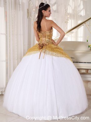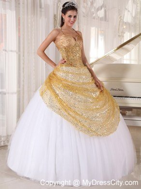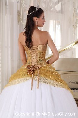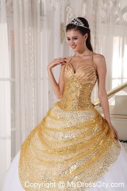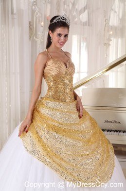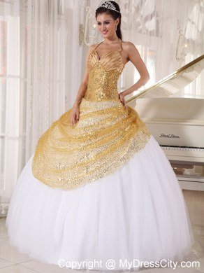 This quinceanera dress features a deep V-neckline and a fabulous halter top. The sequinced tulle layer covered the bodice and the upper bottom in gold color in the front makes the skirt shinning and gorgeous.The white taffeta and tulle pleats at the very bottom creates a slowing style. The lace up back ends with several handed flowers adds interest to the back.