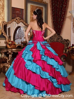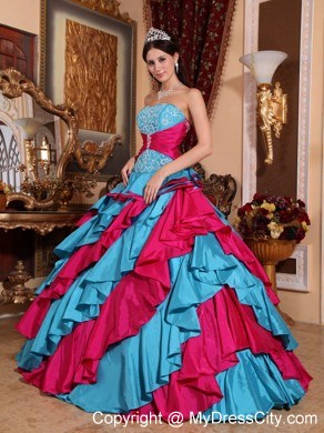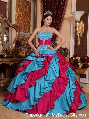 This style is sure to wow! The perfect combination of contrasting turquoise and pink is absolutely a feast for eyes. The strapless bodice is trimmed with exquisite floral embroidery. A waistband adorned with beading and embroidery accents the midsection of the dress. The full skirt sways beautifully when you move, creating a lovely princess style silhouette. Tiers of ruffles give a sense of luxury. With lace-up tie back for great fit.