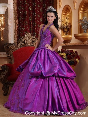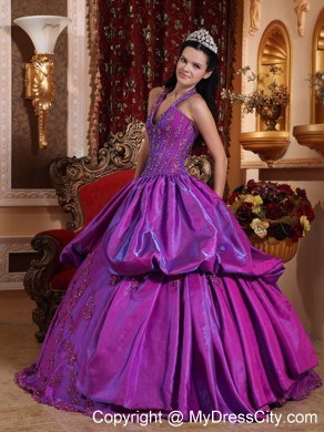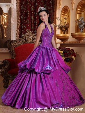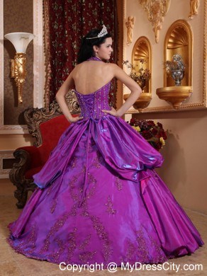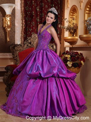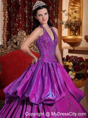 Want to become a princesss on your quinceanera day? Here is the dress to make your dream come true! This chic halter top neck quinceanera dress is featured with the princess style hemline on the bottome of the dress. The neckline swoops down, which looks sexy.And the straight fish bones on the bodice will make your figure look slim.