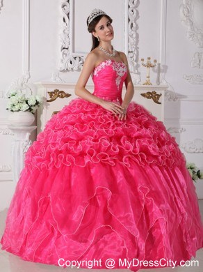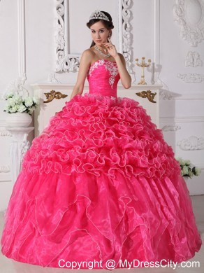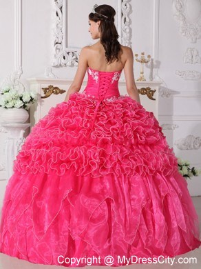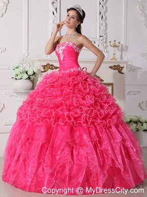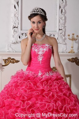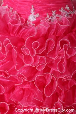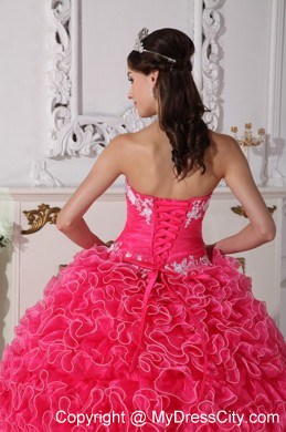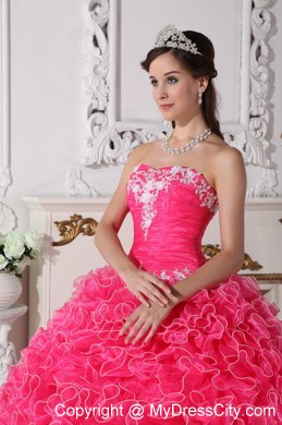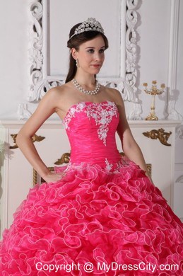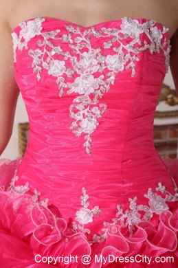 Strapless dresses are one of the sexier styles on the market today. They show just enough skin to be classy without being too revealing. This hot pink quinceanera dress features a strapless bodice and a sweetheart neckline. The bust part is heavily adorned with embroidery. The ruffles on the upper part of the skirt adds interest and grace to the dress.
