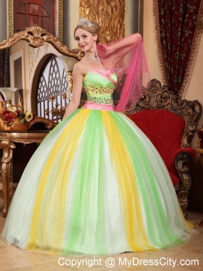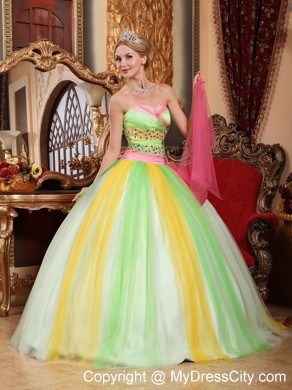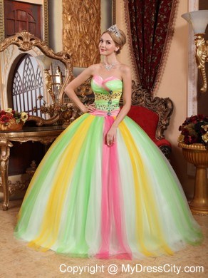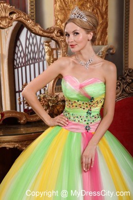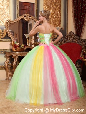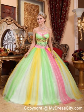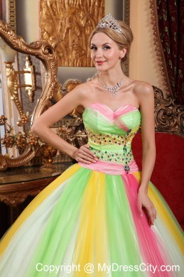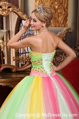 Just be a fairy maiden in this colorful ball gown. Fabulous is the only word came to my mind when I saw it. The dress features A sweetheart neckline with some colorful beadings accented on the bodice.several different colors of tulle which make the dress like a rainbow falls freely to complete the look.