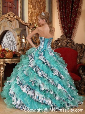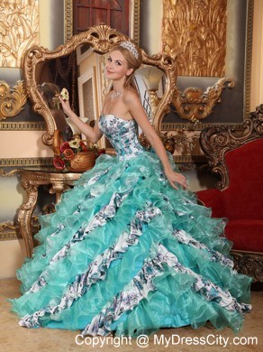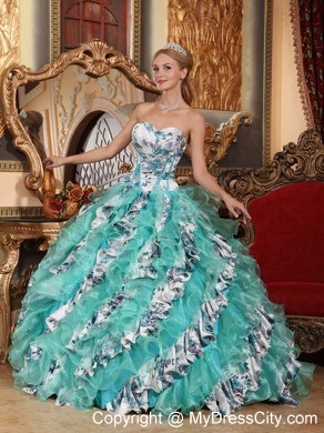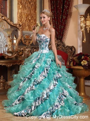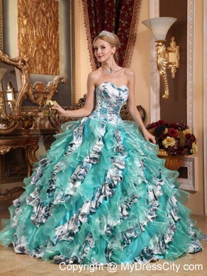 Fabulous and elegant! The sweetheart neckline dress in beight aqua makes you be the lightspot at your party. It features fashionable printed fabric full covered the bodice. Diagonal ruffles in contrasting layers of printed fabric and organza which gives the skirt a full look.Still hesitate? Take it home!