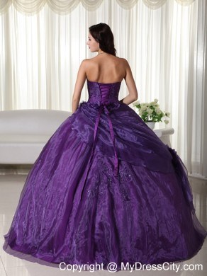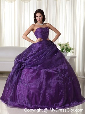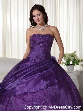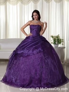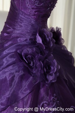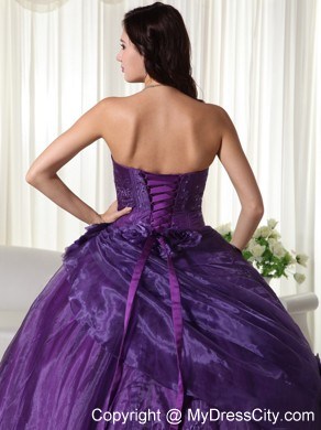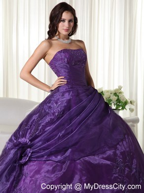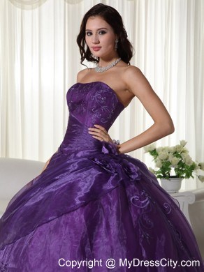 This strapless dress features embroidery on the top part. And some hand-made flowers on the side of waist part make the dress elegant and more ladylike. The out layer is tulle which make the dress glittery and catch your eyes at the first sight. A few hand-made flowers embellished the skirt and lace up back finishes the look of the dress.