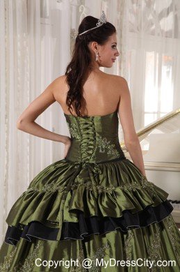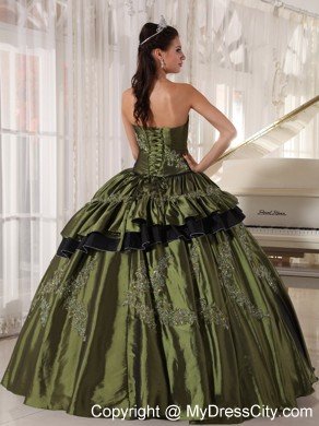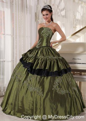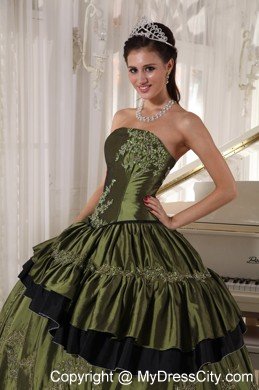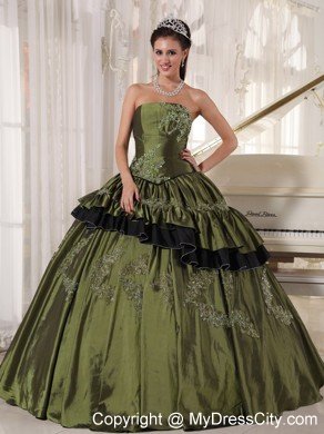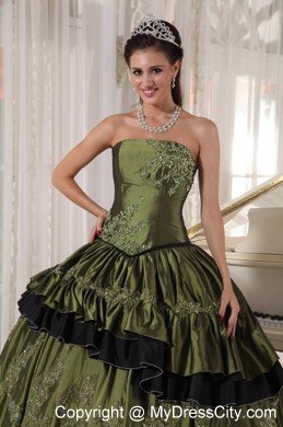 This beautiful straight neckline olive green quinceanera dress is featured with the small skirt covering the bottome of the dress. And the black tulle under the olive dress forms contrasting colors , which impinges your eyes easily. And the silver appliques with beading decorate the dress perfectly.