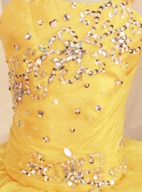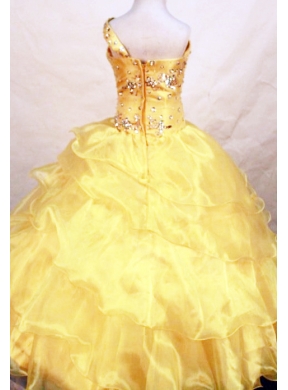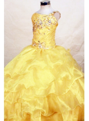 This organza pageant gown displays one shoulder neckline, beaded thick strap on the left shoulder, and beaded bodice. Layers of ruffled organza adorn to perfection the beauty of the skirt spreading admiration to the audience. A ruffled skirt completes the look of this pageant dress. This cute dress is a great choice for your 2013 pageant. Zipper up back.