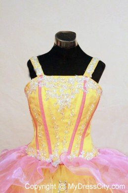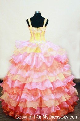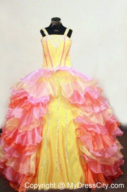 Lovely and striking! This precious multi-colored flower girl dress features a straight neckline on an ball gown silhouette accented with an embellished bodice, and a full skirt with sheer ruffled tiers. Zipper up finishes the look.