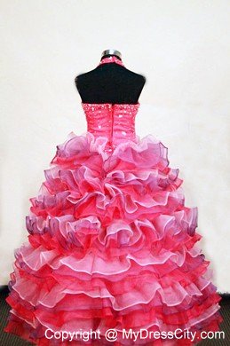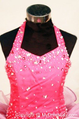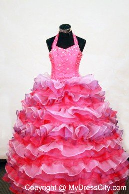 You are sure to stand out with this gorgeous ball gown dress! The fitted bodice features a halter-top neckline with glaring bead work along the neckline and waistline. The breathtaking hot pink ball gown with contrasting purple and white tiers of ruffles. Complete with zipper up back.