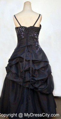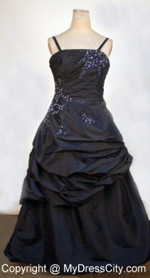This simple yet elegant dress features a strap straight-cut neckline that is adorned with beading on bust and waist area on one side. The taffeta A-line skirt accented with ruffles flatters most figures.