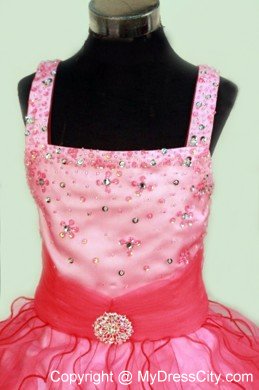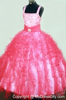 This style is sure to wow! This stunning pageant dress features a straight neckline on a full A-line silhouette accented with a beaded bodice, a ruched waistband with an embellished broach, and a full skirt with wavy soft tulle.