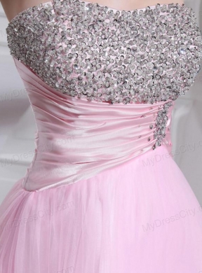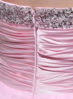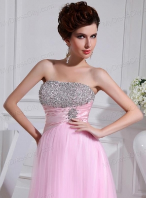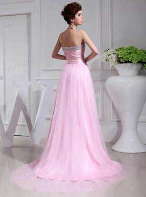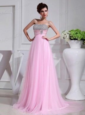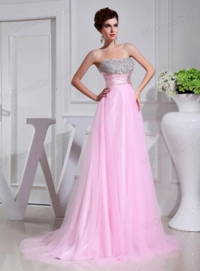 Silhouette:A-line Neckline: Strapless Waist: Fitted Hemline/Train: Brush Train Sleeve Length: Sleeveless Embellishment: Ruchings and Beading Back Detail: Zipper Up Fully Lined: Yes Built-In Bra: Yes Fabric: Tulle and Taffeta Shown Color: Baby Pink(Color & Style representation may vary by monitor.) Occasion: Prom, Formal Evening, Celebrity, Graduation Season: Spring,Summer,Fall