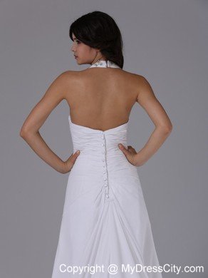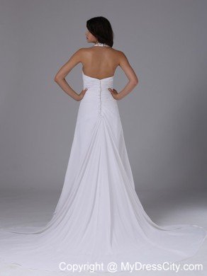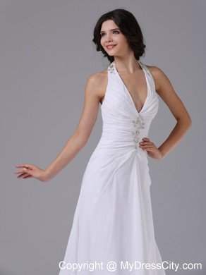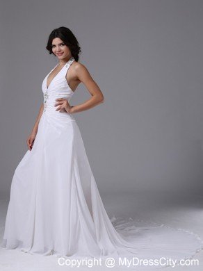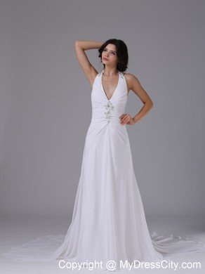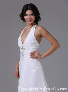 You will surely be attracted by this sassy and flattering prom dress at the first sight. It features a deep v-line neckline with halter top and pleated empire waist. Shimmering and sparkling beadings are enrusted on the halter and the middle of the waist. The skirt is long and flowing that moves graciously when you walk. The closure is encrusted with fastener extending to the very bottom of the train, which makes the dress standout. You cannot miss it!