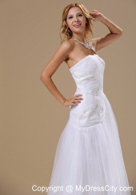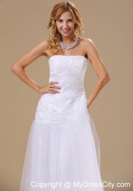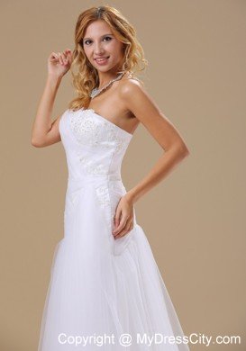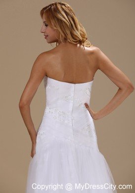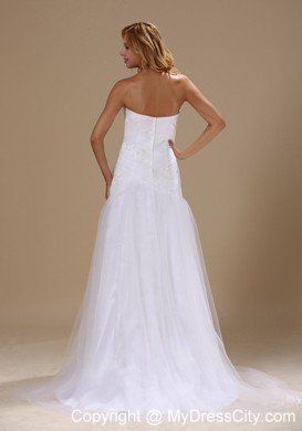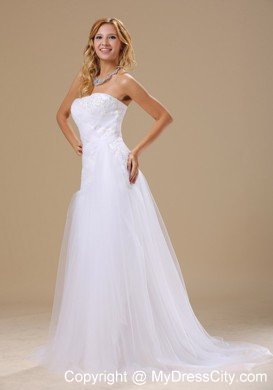 This gorgeous white brush wedding dress is highlighted by the appliques and the beadings adorned all over the fitted bodice, which makes the dress full of fragrance. The tull skirt with the brush train flows beautifully when you move. If you are looking for your dream wedding dress with royal atmosphere, then just picks up this dress.