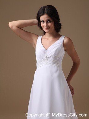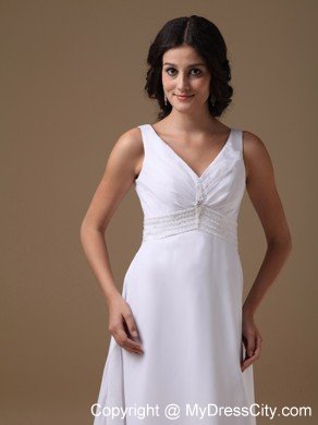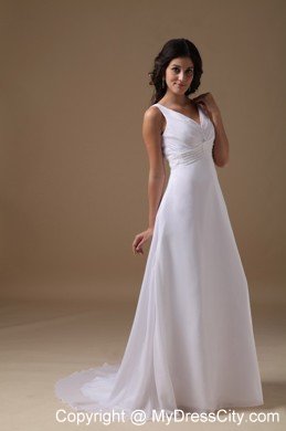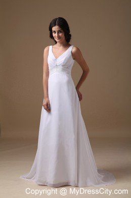 This elegant wedding dress is crafted in luxurious chiffon, features a straps V-neck. A ruched band decorated with some clear beadings defines the waist and some loose ruching on the bust accented the sexy design. A glamous deep V-shape zipper-up back ensures a perfect fit. Featured with A-line sweep train and light materials chiffon and lustrous charmeuse, this beach wedding dress is the right choice for brides who want to enjoy a fantastic golden beach ceremony.