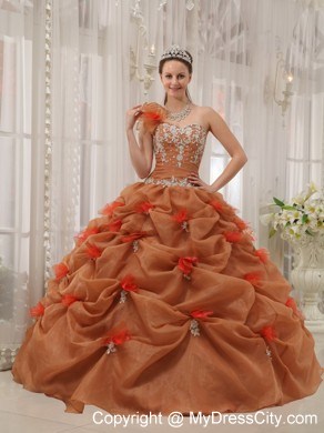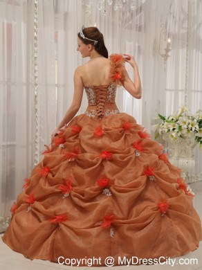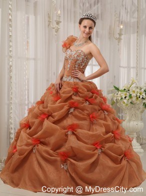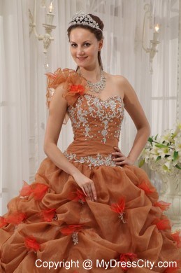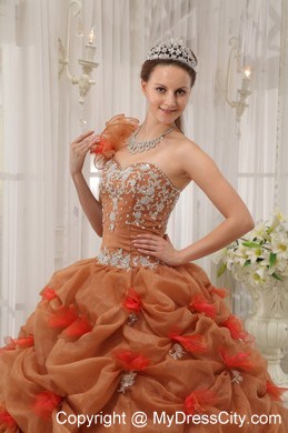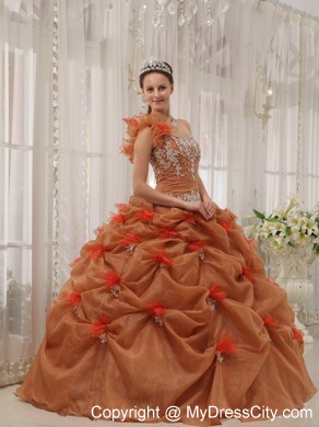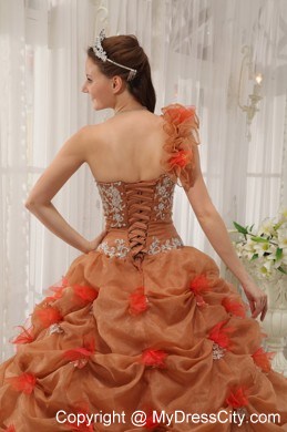 This gorgeous quinceanera gown features a ruffled one shoulder strap and a sweetheart neckline. The bodice is decorated appliques and achieveing a exquisite look. The gown accents the pick-ups with red flowers and white appliques through out,maks the dress a attractive looking. A lack up back finishes the look. A gorgeous and elegant dress for any who wants to 'wow' the crowd.