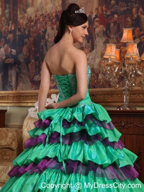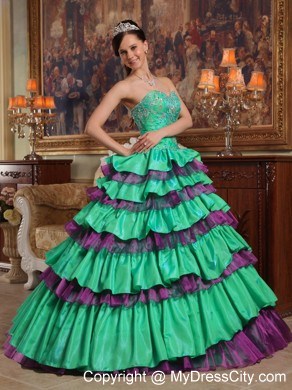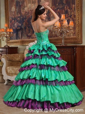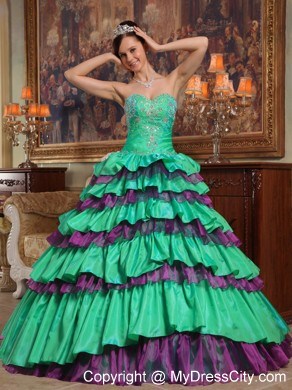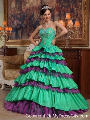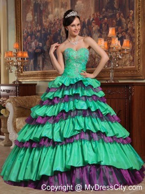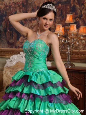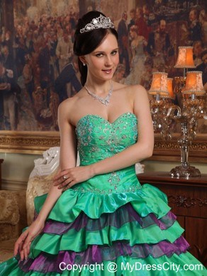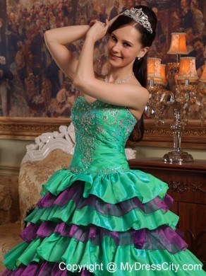 The green and purple two toned ball gown of Organza and Taffeta, perfect for any formal Birthday or Special occasion. It has a strapless bodice with a lovely sweetheart neckline, gorgeous beaded embroidery and elegant ruched waist.Below the waist, multiple tiers create volume and dimension. With this dress on, you will be the only princess in the party.