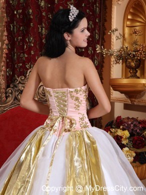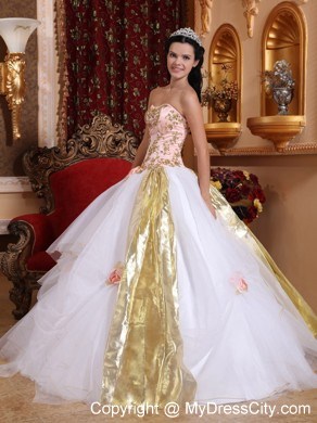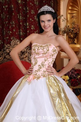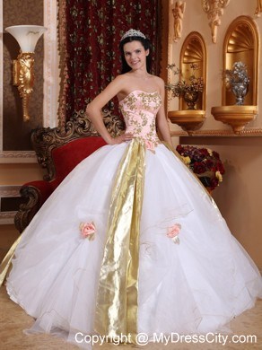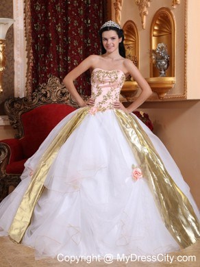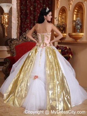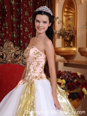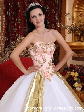 Strapless dresses are one of the sexier styles on the market today. This one features a strapless bodice with wrapped details and a pretty rose along the waist. Golden, shimmering embellishments adorn the dress throughout and catch the light in a dramatic way. This gown has a lovely ruch bodice and a pleated skirt.The dress sways beautifully across the floor when you move, as if you're floating on air. A lace up back completes this wonderful design.