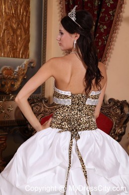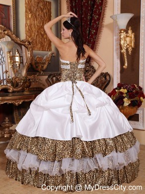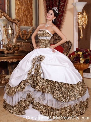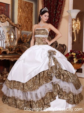 Take a walk on the wild side in this fabulous leopard-inspired dress. It features a strapless bodice with shimmering beads and special leopard fabric and full skirt with multi-tiered ruffles. A big handmade flower draws lots of interest to the midsection. The gorgeous full skirt is made from various fabric, which add to its beauty, fullness and lovely shape. This is a fantastic choice for someone wanting something a little different for their special occasion. With lace-up tie back for great fit.
