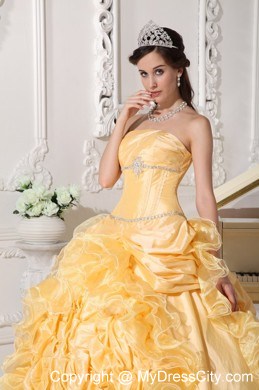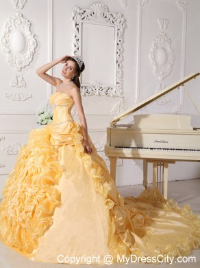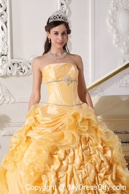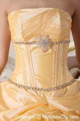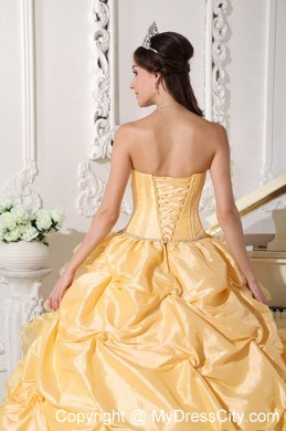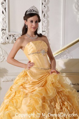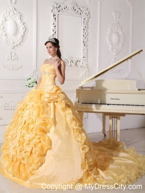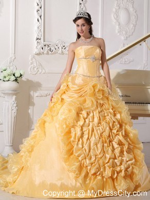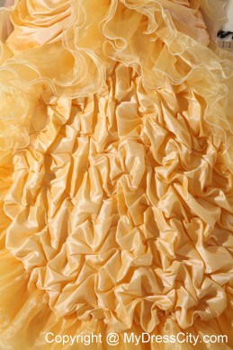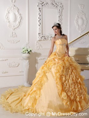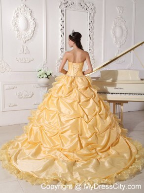 You will be stunning in the dance floor. The top bodice has two lined beading around the bust and waist and lace up back. The full ball gown skirt has grace and movement. It features a flower assumingly a sunflower in the front overlay and a chapel train in the back, which attract a lot of attention. You will capture the lighting beautifully in this light yellow quinceanera dress!